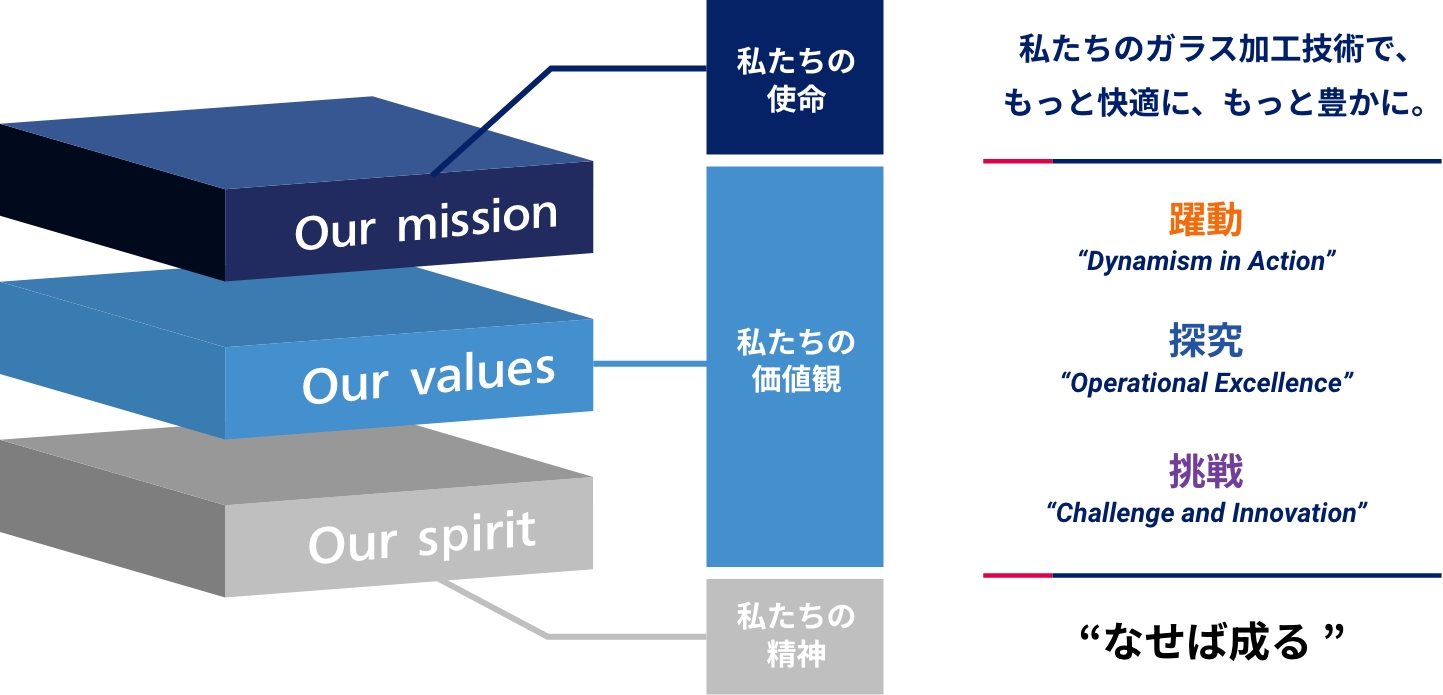 私たちは、One Teamで高い目標に挑み、優れたガラス加工技術で新たな価値を創造します